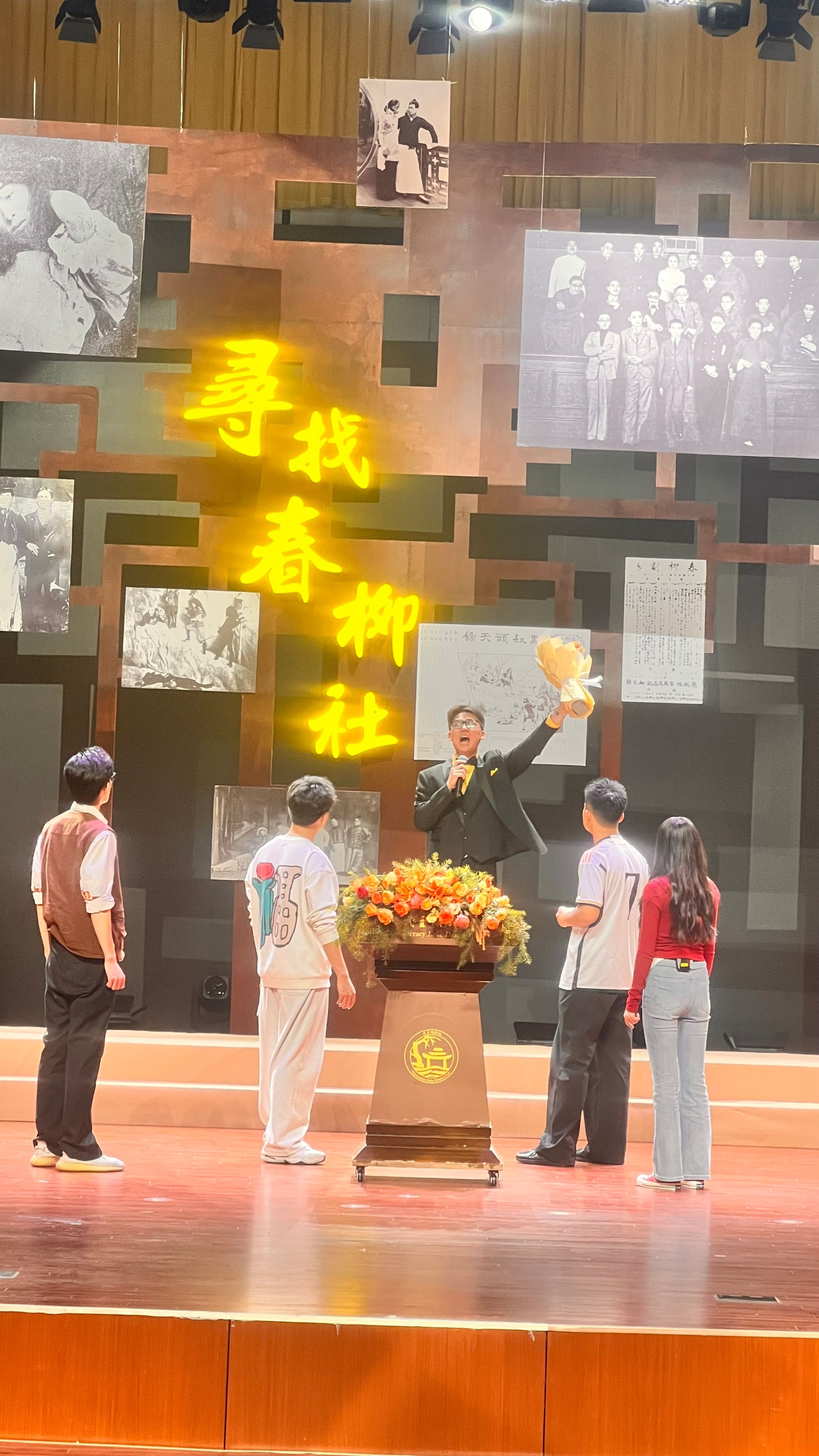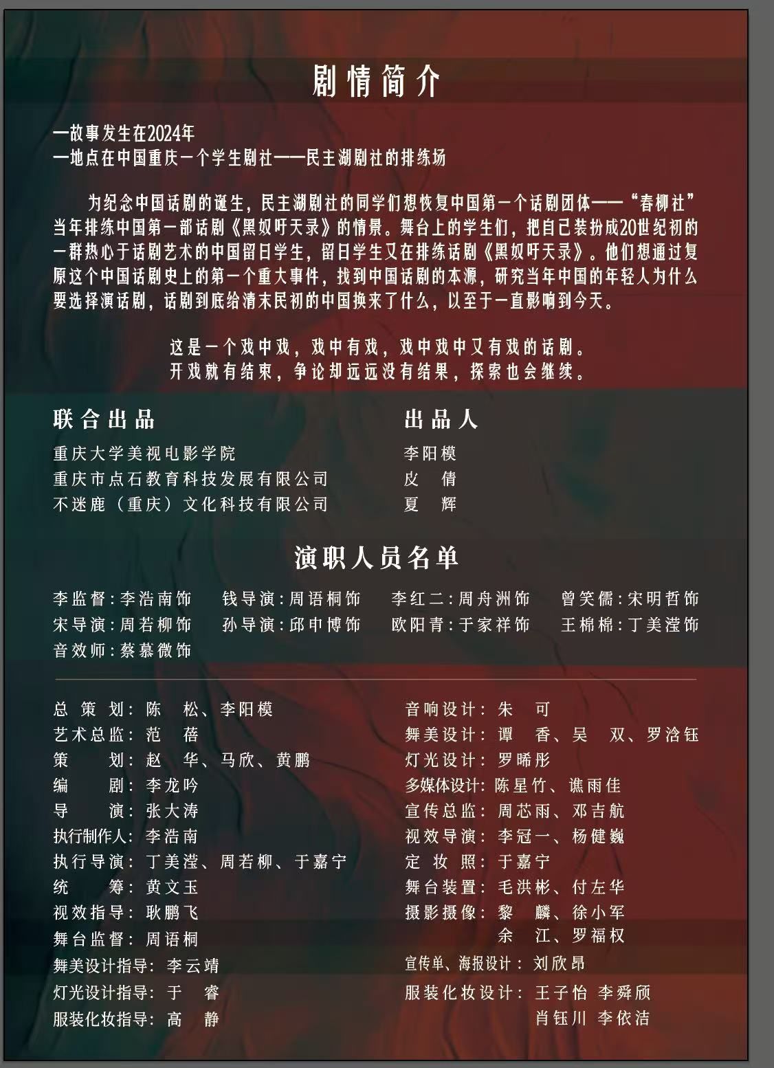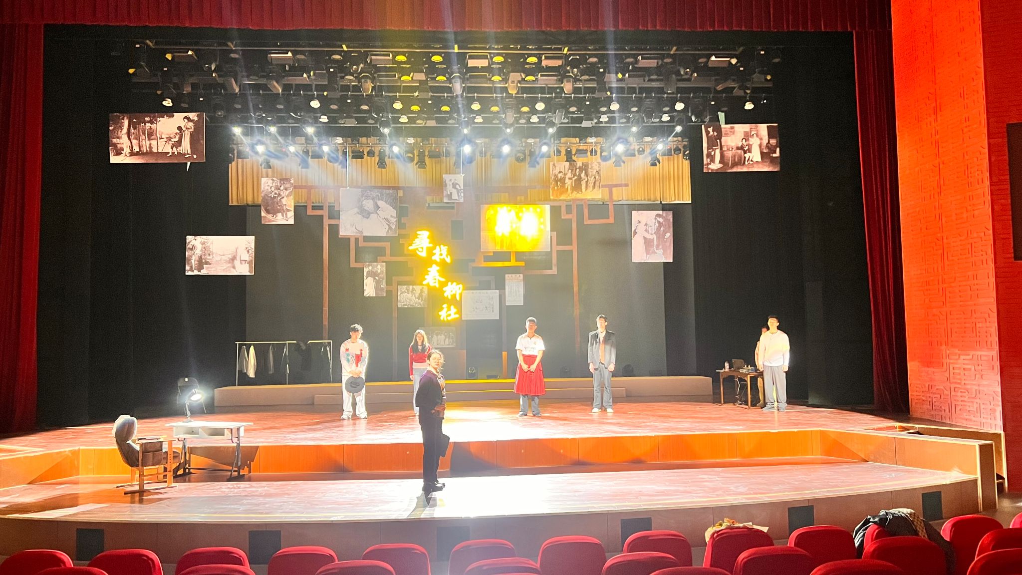 《寻找春柳社》这部极具特色的话剧,其独特的戏中戏结构堪称一大亮点。它宛如一座跨越时空的艺术桥梁,巧妙且自然地将现代戏剧人的探索、思考与对春柳社那段光辉历史的追溯紧密融合在了一起,编织出了一幅层次丰富、韵味悠长的艺术画卷。在导演的精心编排下,以及演员们的精彩演绎中,其独特的艺术魅力被展现得淋漓尽致。该剧共九位演员,分别由李浩南饰演李监督;周舟洲饰演李红二;于家祥饰演欧阳青;宋明哲饰演曾笑儒;丁美滢饰演王棉棉;周若柳饰演宋导演;周语桐饰演钱导演;邱申博饰演孙导演;蔡慕微饰演音效师。