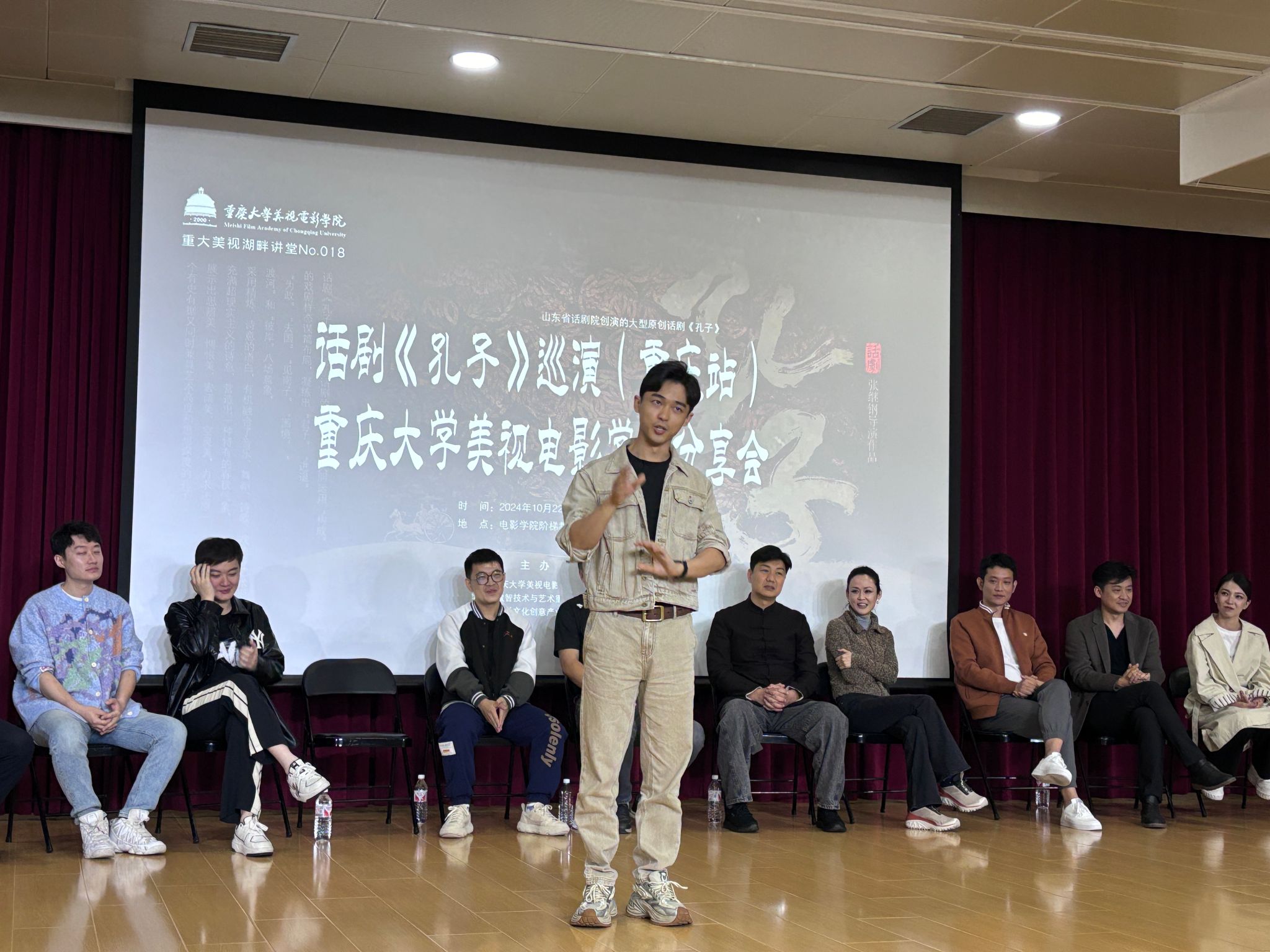 山东省话剧院副院长王翔向大家介绍了话剧《孔子》剧目的相关情况。接着,各主创嘉宾用自己特别的方式向大家介绍了自己及在剧中所扮演的角色。随后,各位主创演员分享了剧目创作演出台前幕后的排练花絮等,为学生提供了宝贵的艺术创作经验。