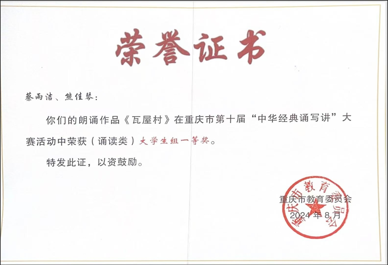 2024年8月,由重庆市教育委员会、重庆市语言文字工作委员会主办的第十届重庆市中华经典诵写讲大赛落下帷幕。肉视频 选送三部作品,分别是播音与主持系2022级学生蔡雨洁、熊佳琴创作的作品《瓦屋村》,2022级学生朱晨曦、高骏渝、官新翔的作品《登上地球之巅》和2023级学生邹佳益、黄圣植的作品《不朽的雕像》喜获佳绩,均获重庆市第十届重庆市中华经典“诵写讲”大赛(诵读类)大学生组一等奖。