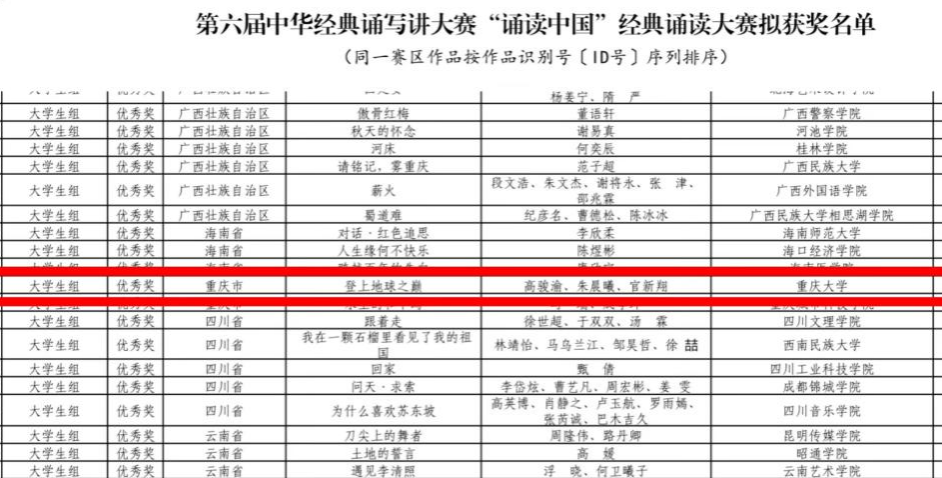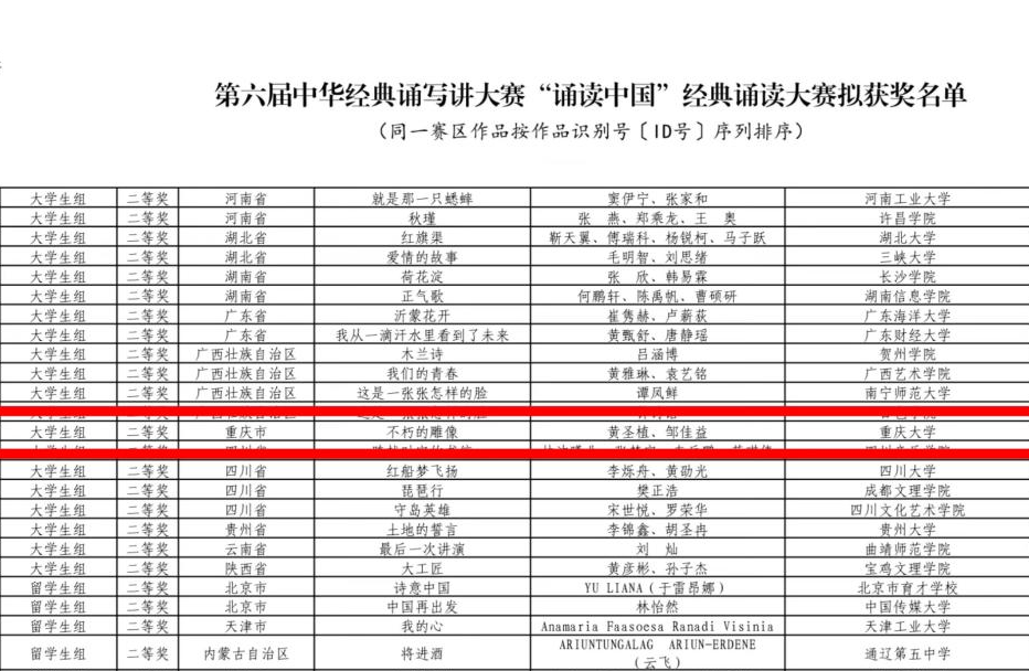 播音主持系的两组参赛队伍共5名同学晋级总决赛,最终2023级学生邹佳益和黄圣植的作品《不朽的雕像》荣获大学生组全国二等奖,2022级朱晨曦、高骏渝、官新翔的作品《登上地球之巅》获得大学生组全国优秀奖。