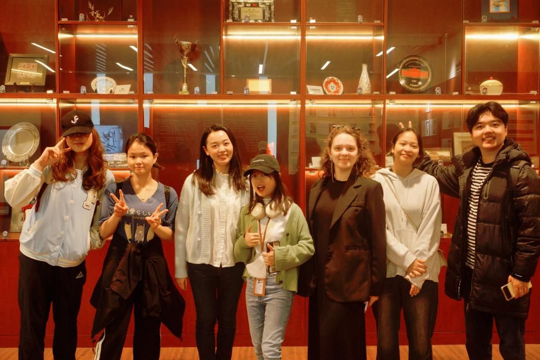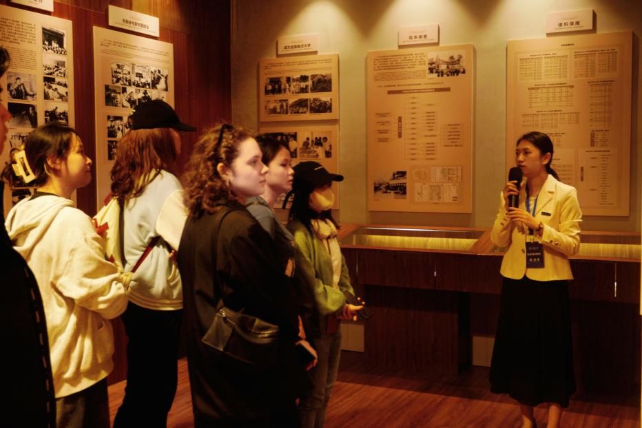 校史馆,上午10点30分,留学生班主任丁艺老师带领留学生同学有序入馆参观。