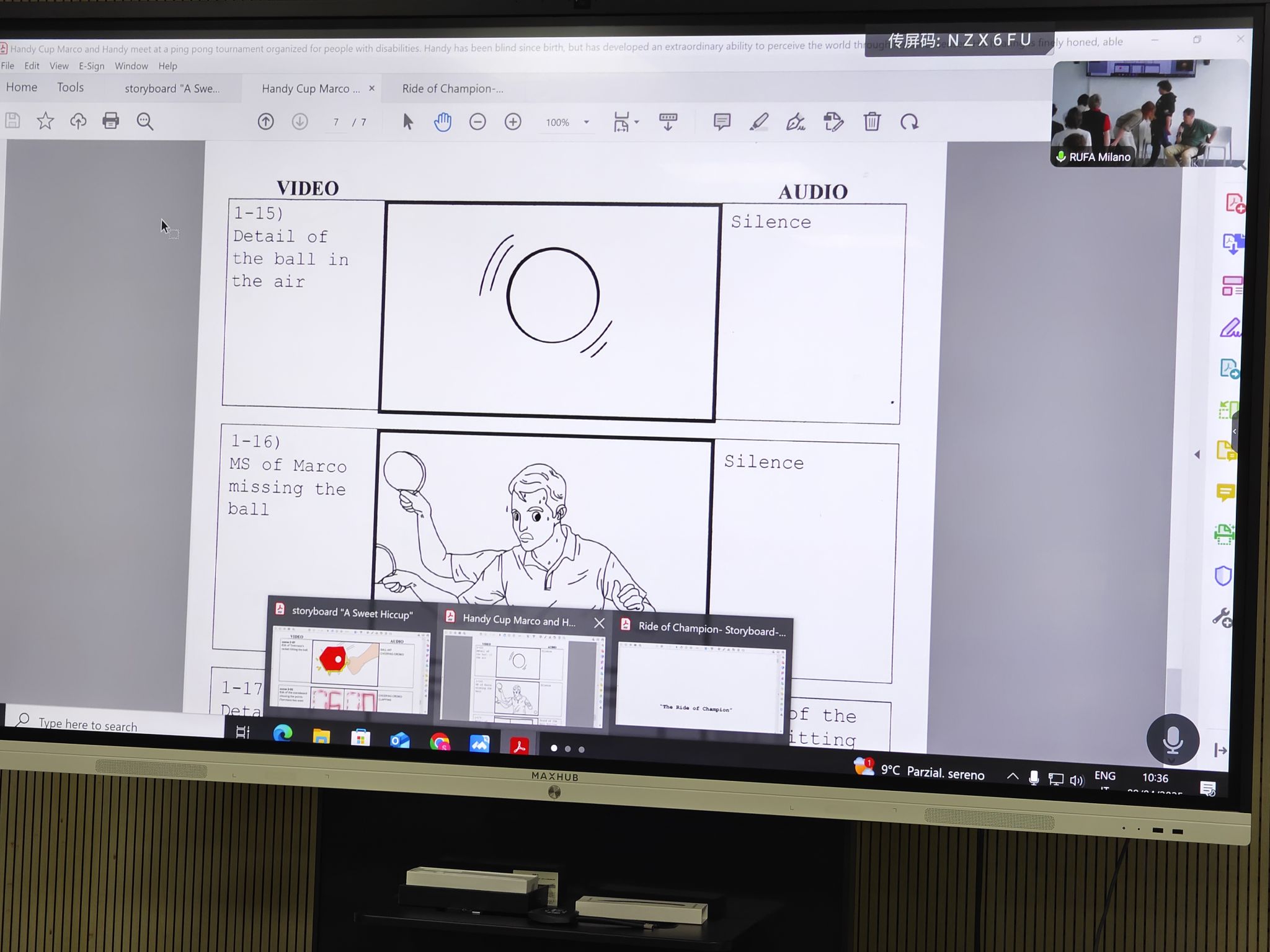 的同学们分享了主题为《最后一击》和《看不见的冠军》的1分钟故事板。每个小组的故事都展现出了丰富的想象力和专业的故事板策划、制作能力。有些故事还有异曲同工的呼应。在交流过程中,中意双方的师生不仅展示了各自的专业素养,还增进了互相的了解。