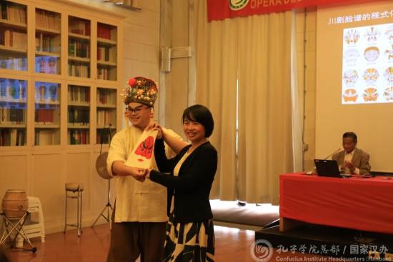 比萨孔院中方院长吴雪燕与演员进行脸谱展示