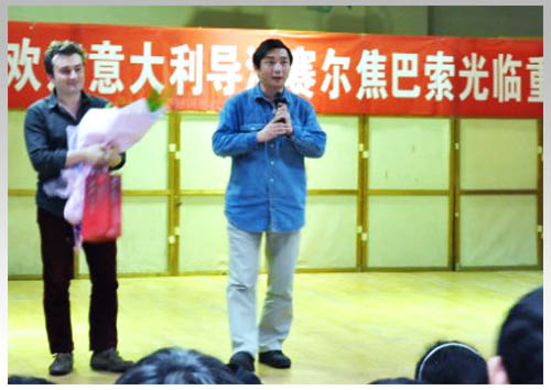 意大利导演塞尔焦·巴索(右一)在现场与同学们讨论他的影片