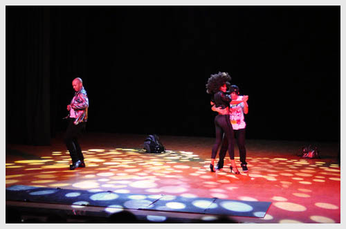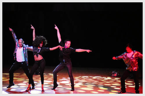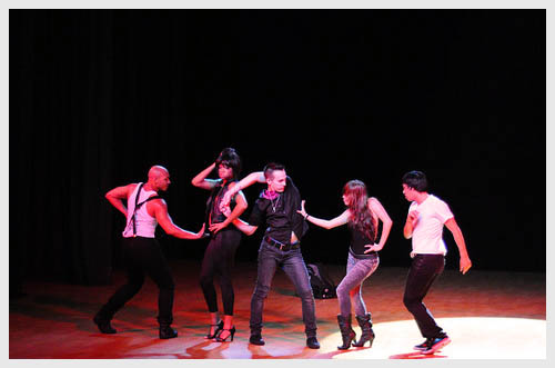 随后,“舞动美国”代表团奉献出了他们精彩演出。晚会舞台采用毫无装饰的裸台表现形式,他们将迪斯科、嘻哈、拉丁舞、踢踏舞和吉特巴舞组成一系列趣味十足、生动活泼的表演,以众多美国经典的舞蹈风格讲述了美国不同年代的发展历史和不同美国城市的文化背景故事,加上目不暇接的舞台服装,让观众有种穿越时空的错觉,仿佛身临其境目睹美国的往日风采。尽管语言不通,但舞蹈是能够超越所有语言和文化界限的艺术形式。舞蹈《舞动美国》以如火如荼的舞蹈语言、强烈奔放的节奏、精湛的舞艺,引发了台下同学们不息的掌声和喝彩,通过富有激情的舞台演绎,感染和带动了现场所有的观众,现场气氛热情洋溢。中场休息时,还举行了有奖问答,美国朋友为回答正确的重大同学赠送礼物。不仅增加了学生们对美国文化的了解,增进了中美之间的友谊和文化交流,同时也给肉视频