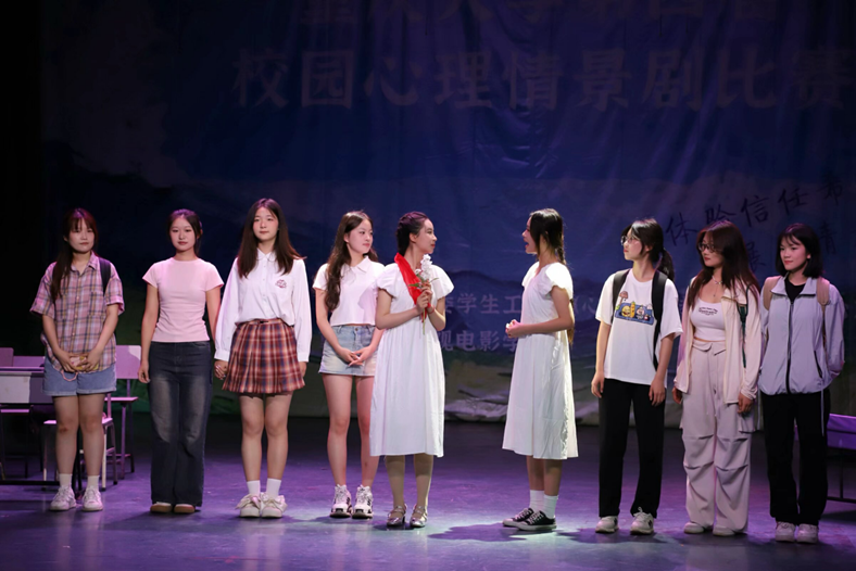 2023级表演专业的同学们带来的原创情景剧《鲜花》中,主角小蝶因患有双相情感障碍,时常在躁狂或抑郁的状态中痛苦不堪,她经历着宿舍矛盾、无法面对与男友间的亲密关系,感觉失去了生活的动力。最终,在老师和家人的帮助下,经过心理治疗的小蝶接纳了自己的不足,与有优点、也有缺陷的自己相拥,看到了未来的希望,鲜花永恒地绽放在了她的心里。该剧目取得总分第三名的成绩。