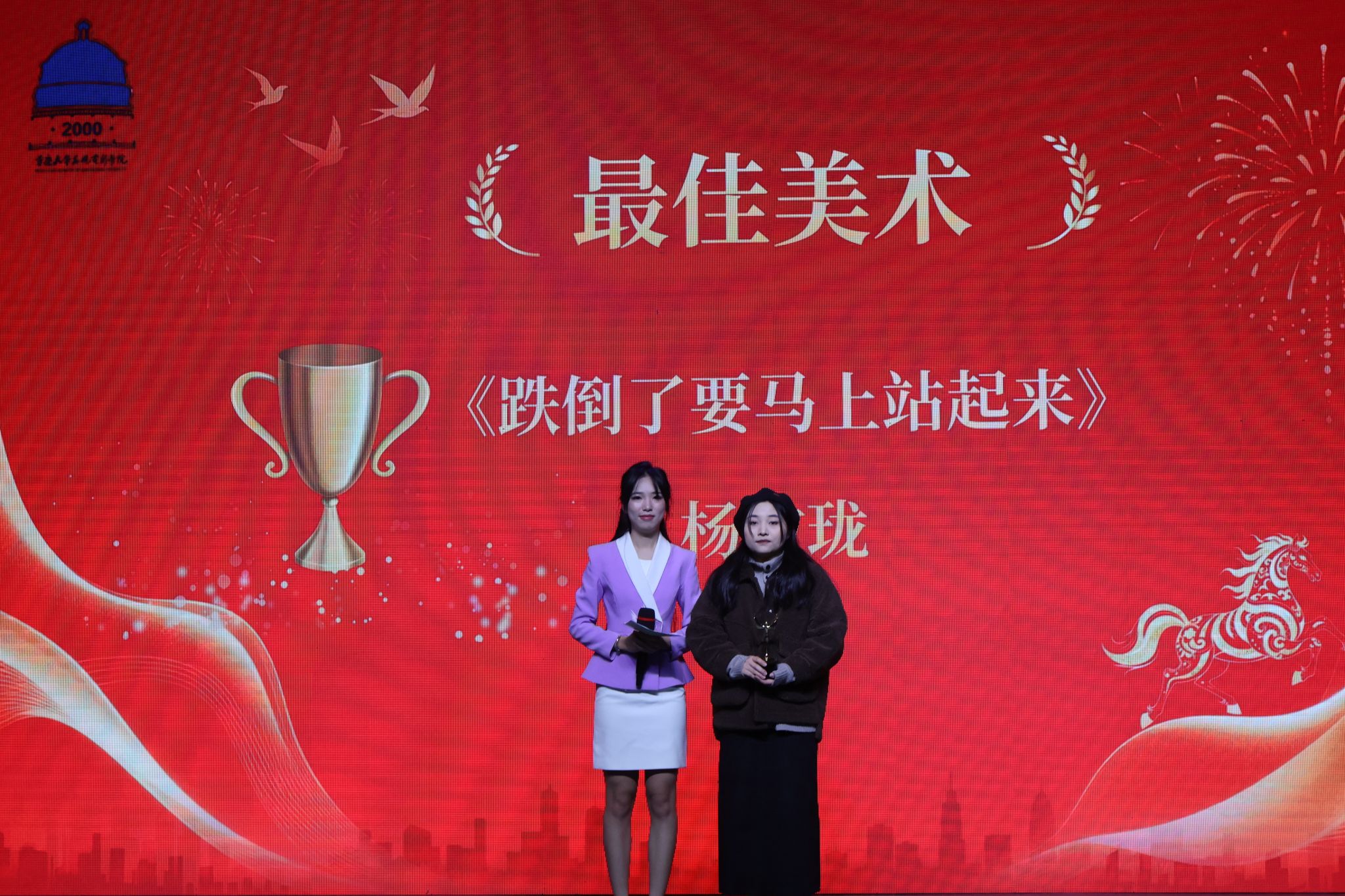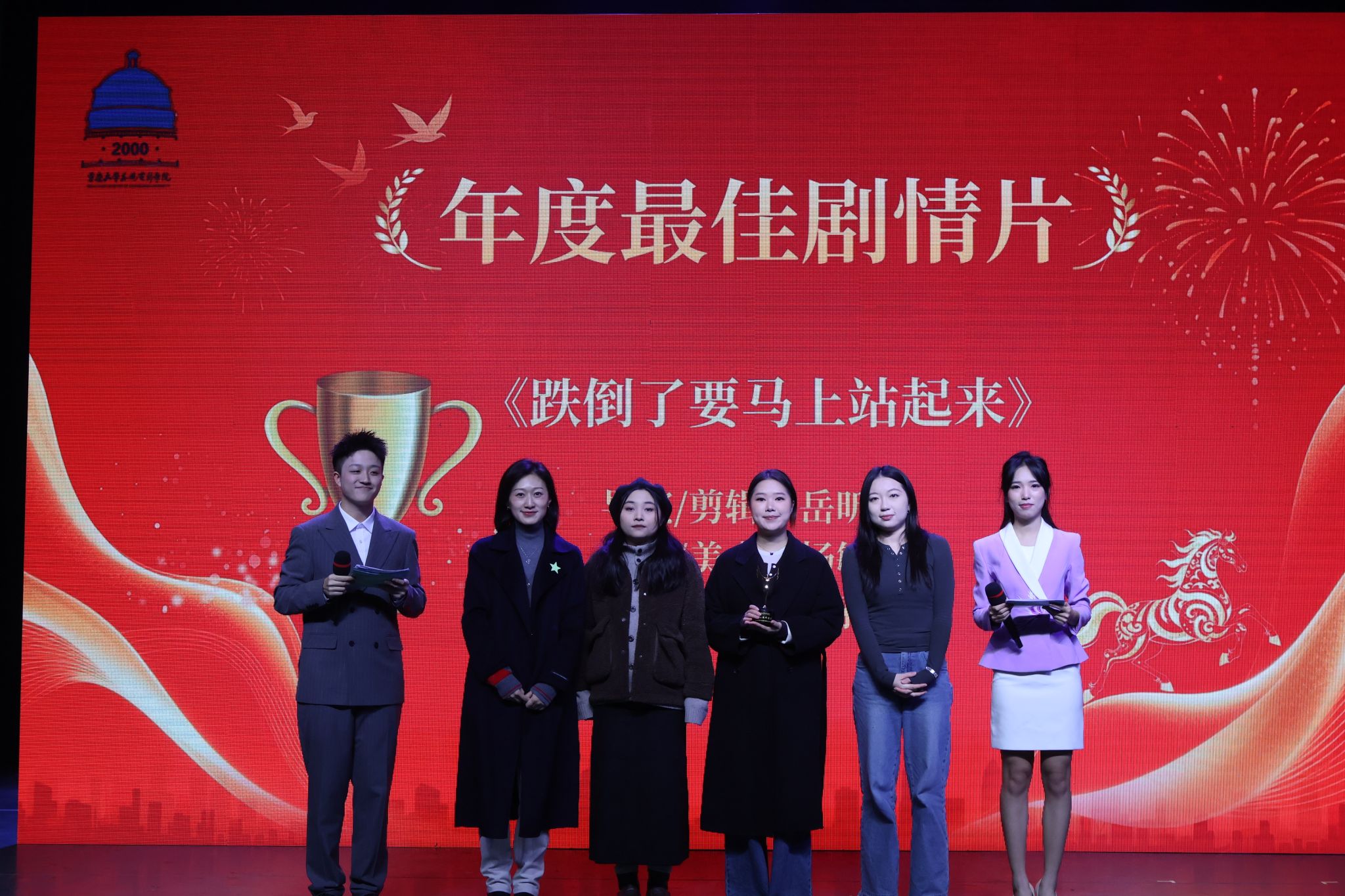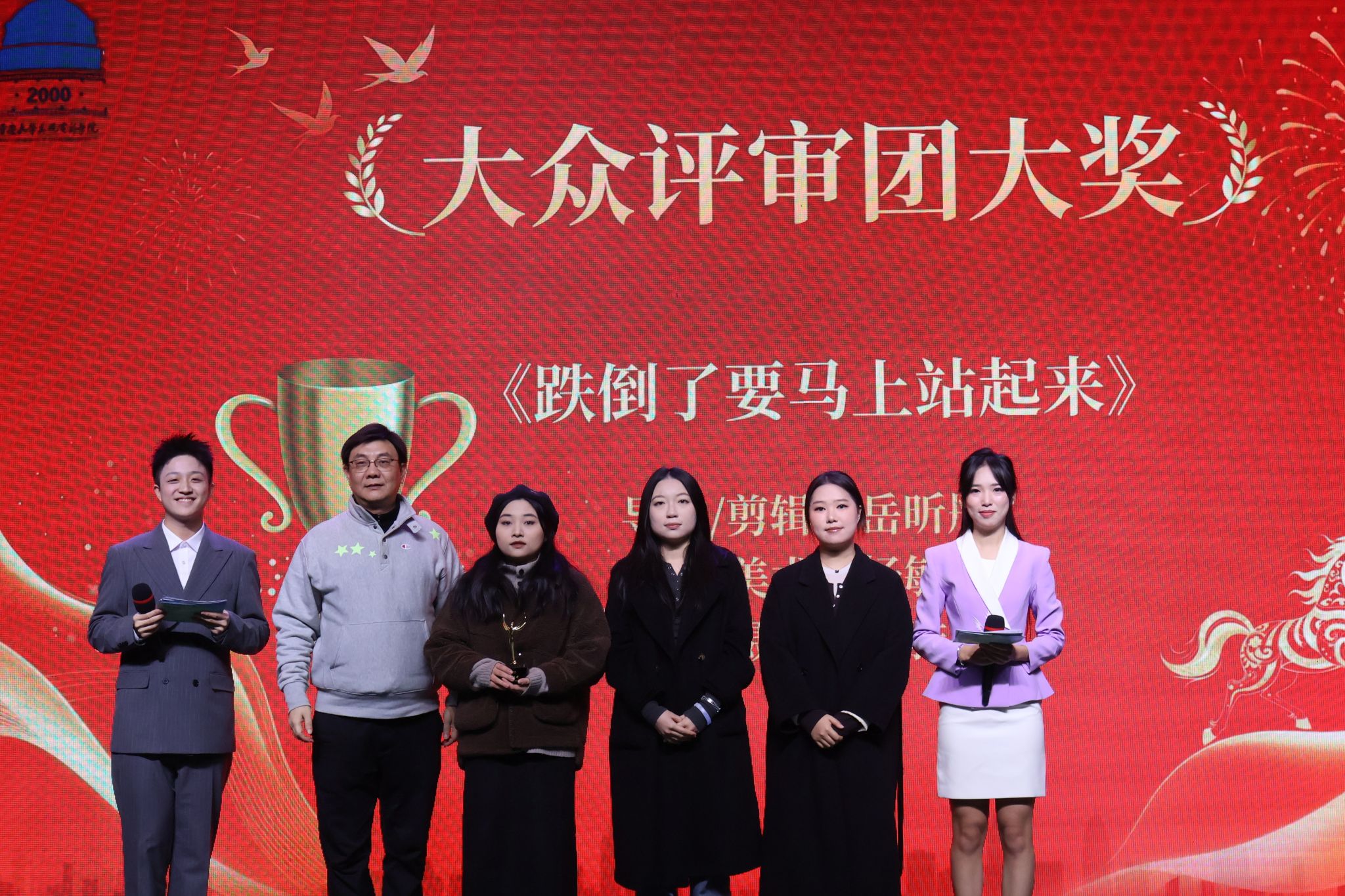副院长马欣教授分别为《跌倒了要马上站起来》的主创团队——岳昕彤、杨敏珑和释雅雯颁发“年度最佳剧情片”和“大众评审团大奖”,并送上祝福。该片在羊毛毡质感与温情内核中产生奇妙共振,用童真动画包裹面对生命的韧性态度,引发观众广泛共鸣。