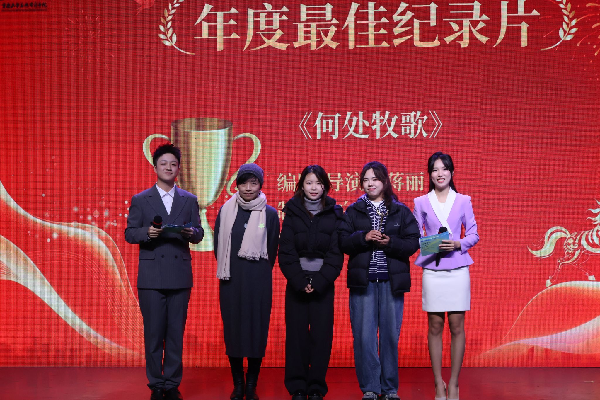纪录片中心主任徐蓓教授为《何处牧歌》的主创团队——蒋丽和白晓茜颁发“年度最佳纪录片”奖并送上祝福。该片聚焦新农人返乡故事,记录 “走出去的渴望与留下来的眷恋”,以沉静有力的影像为“何以为家” 提供独特答案。