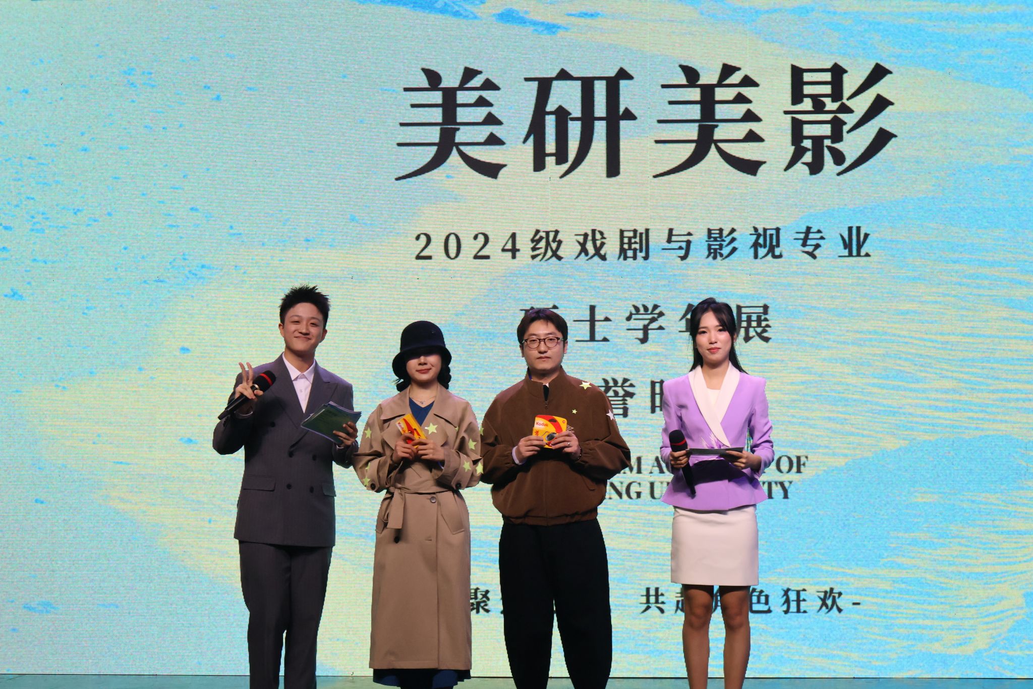 激动人心的获奖时刻将现场氛围推向高潮,同学们也纷纷畅聊拍摄过程中的难忘瞬间。此外,本次学年展增设了一系列独特环节——老师和同学们在活动伊始装扮成经典电影角色入场,并为心仪的造型粘贴荧光贴纸。在现场观众呼声中,王佳芝(《色戒》)和马杰(《年会不能停》)两套cos造型获得活动特别奖项“最佳造型奖”。