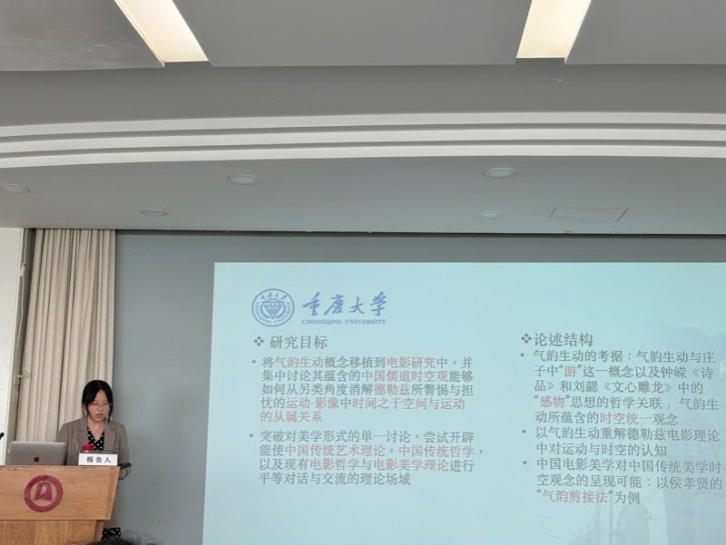 范炜婷博士在主题论坛就其论文《气韵生动与中国电影美学的时空观》进行了汇报发言。范炜婷博士将中国传统艺术理论中“气韵生动”的概念移植到电影研究中,以其蕴含的中国儒道时空观,从另类角度消解德勒兹所警惕与担忧的运动影像问题。范炜婷博士指出,应将现有的电影哲学与电影美学理论与中国传统艺术理论与哲学相结合,把握好具有民族精神特质的影像研究方法,彰显中华优秀传统文化研究的新时代风格。