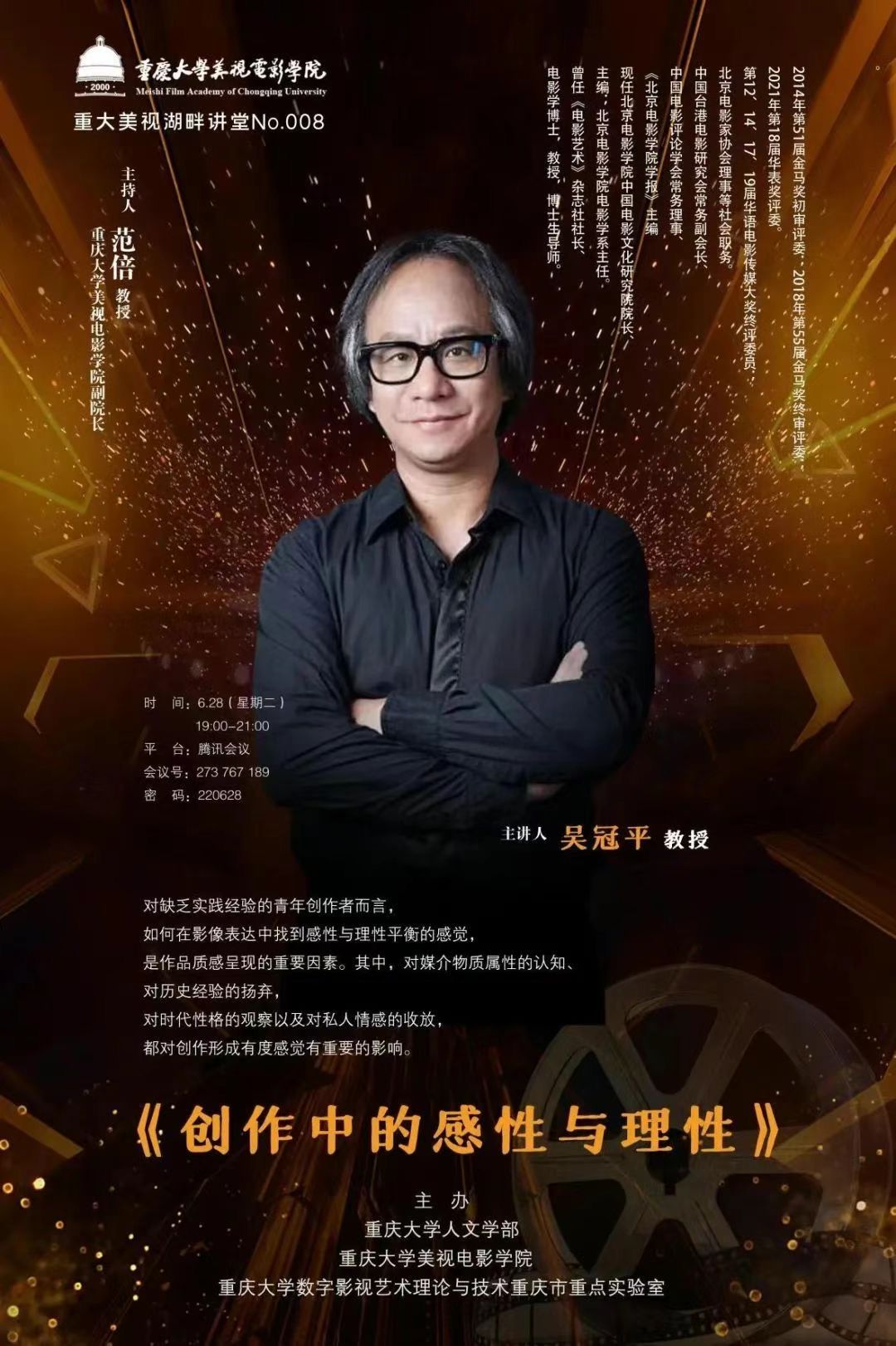 2024-05-17创作中的感性与理性 主 讲 人:吴冠平教授主 持 人: 范蓓教授时 间: 2022年6月28日 19:00——21:00地 点:腾讯会议线上讲座(会议号:273 767 189)主 办:肉视频 人文学部 肉视频 内容简介: 本讲座围绕主题“创作中的感性与理性”,讲解对缺乏实践经验的青年创作者而言,如何在影像表达中找到感性与理性平衡的感觉。理性与感性是作品质感呈现的重要因素,其中,对媒介物质属性的认知、对历史经验的扬弃,...