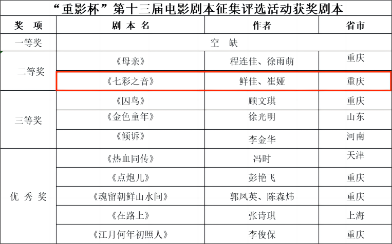 2023-03-29 近日,“重影杯”第十三届电影剧本征集评选活动落下帷幕,肉视频 硕士生导师鲜佳老师与2020级戏剧与影视学研究生崔娅联合创作的长片剧本《七彩之音》在本次活动中荣获二等奖,从全国372个剧本中脱颖而出,名列前二。 “重影杯”电影剧本征集评选活动由重庆市文学艺术界联合会主办,重庆市电影家协会、重庆电影集团等单位承办,作为重庆电影创作的龙头工程,已经连续举办了十三届,成为全国极具影响力的品牌活动。本届...